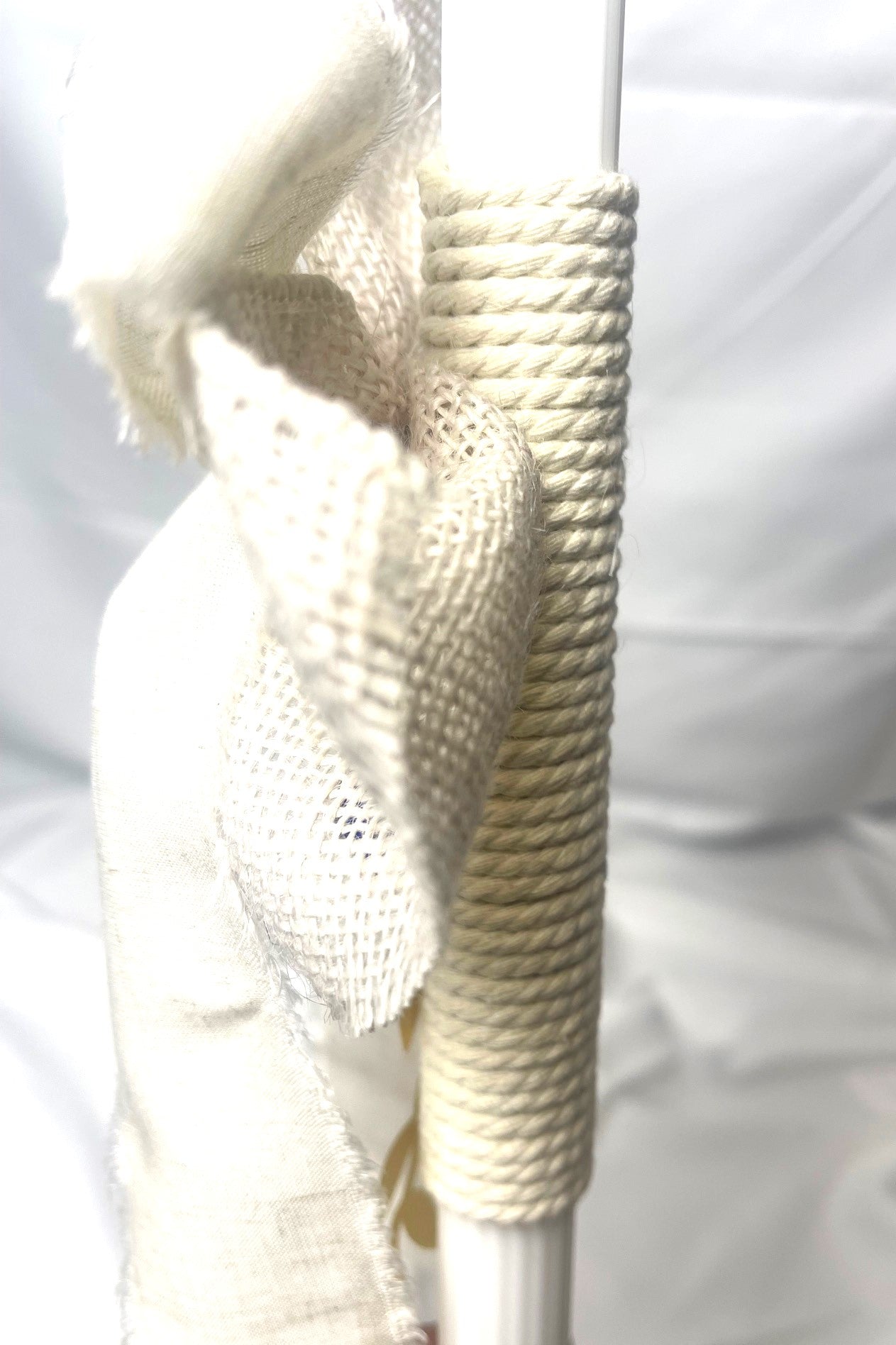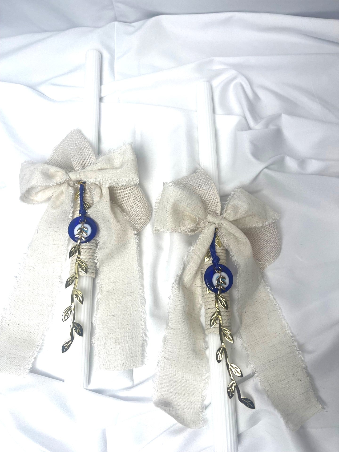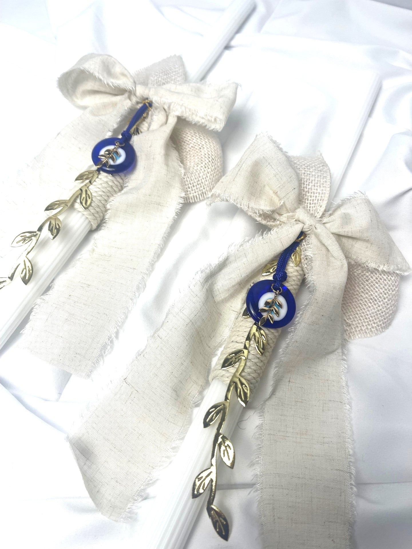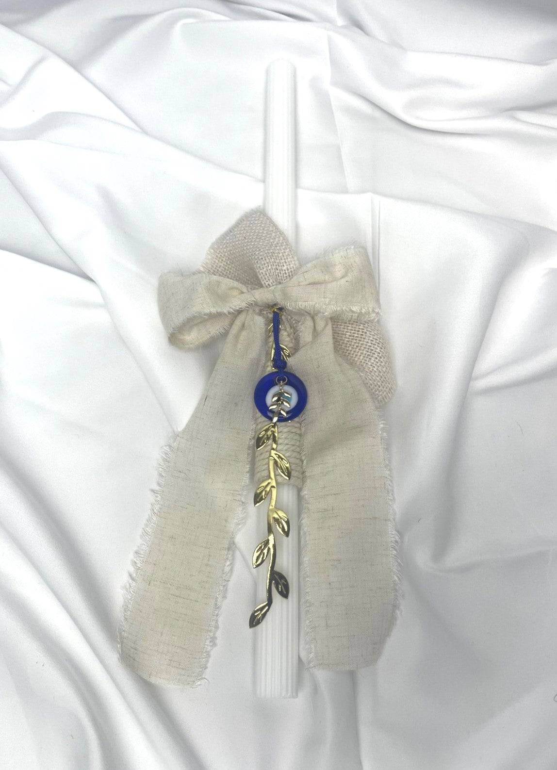 This elegant Easter candle is embellished with a glass mataki (evil eye) pendant combined with soft beige ribbon and burlap ribbon. Round Ribbed Candle that is 40cm in length 22mm thickness. (Purchase our Church Candle Holder for a complete Gift set idea)
