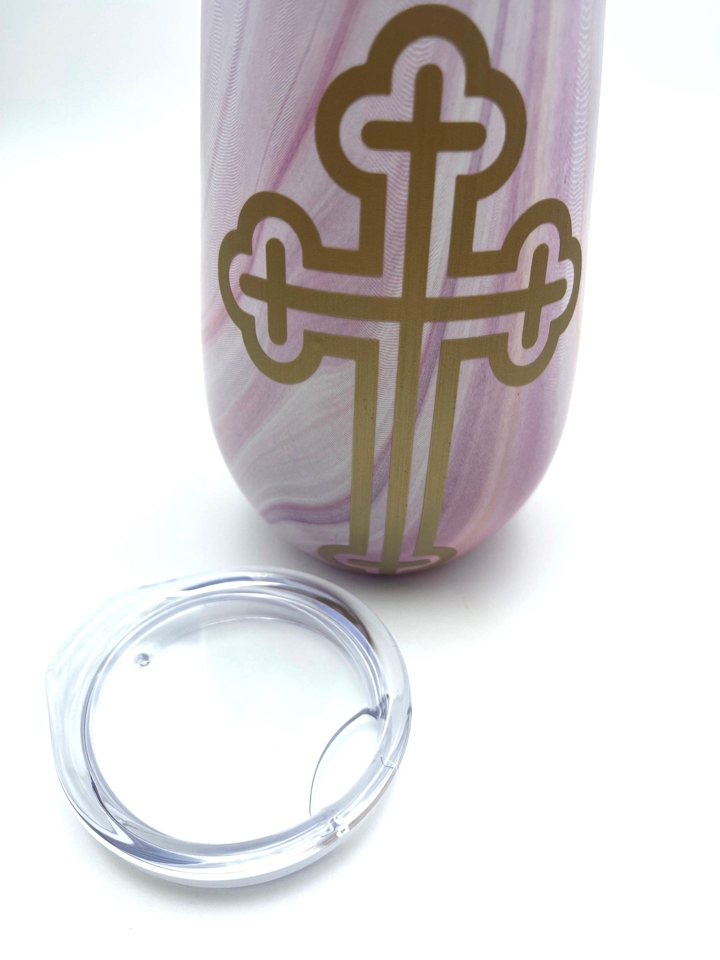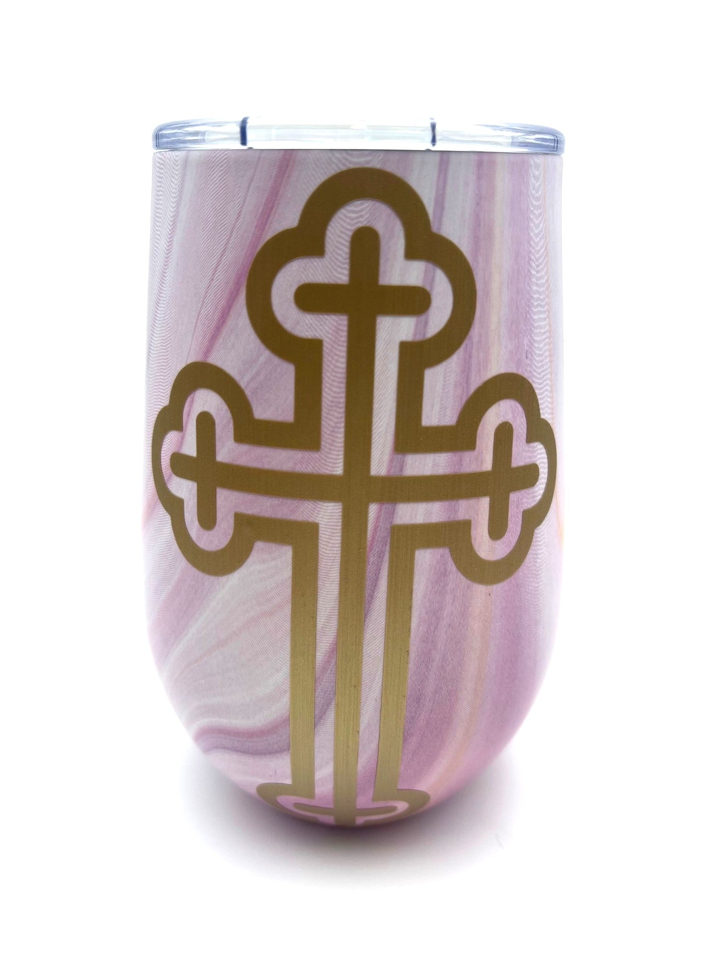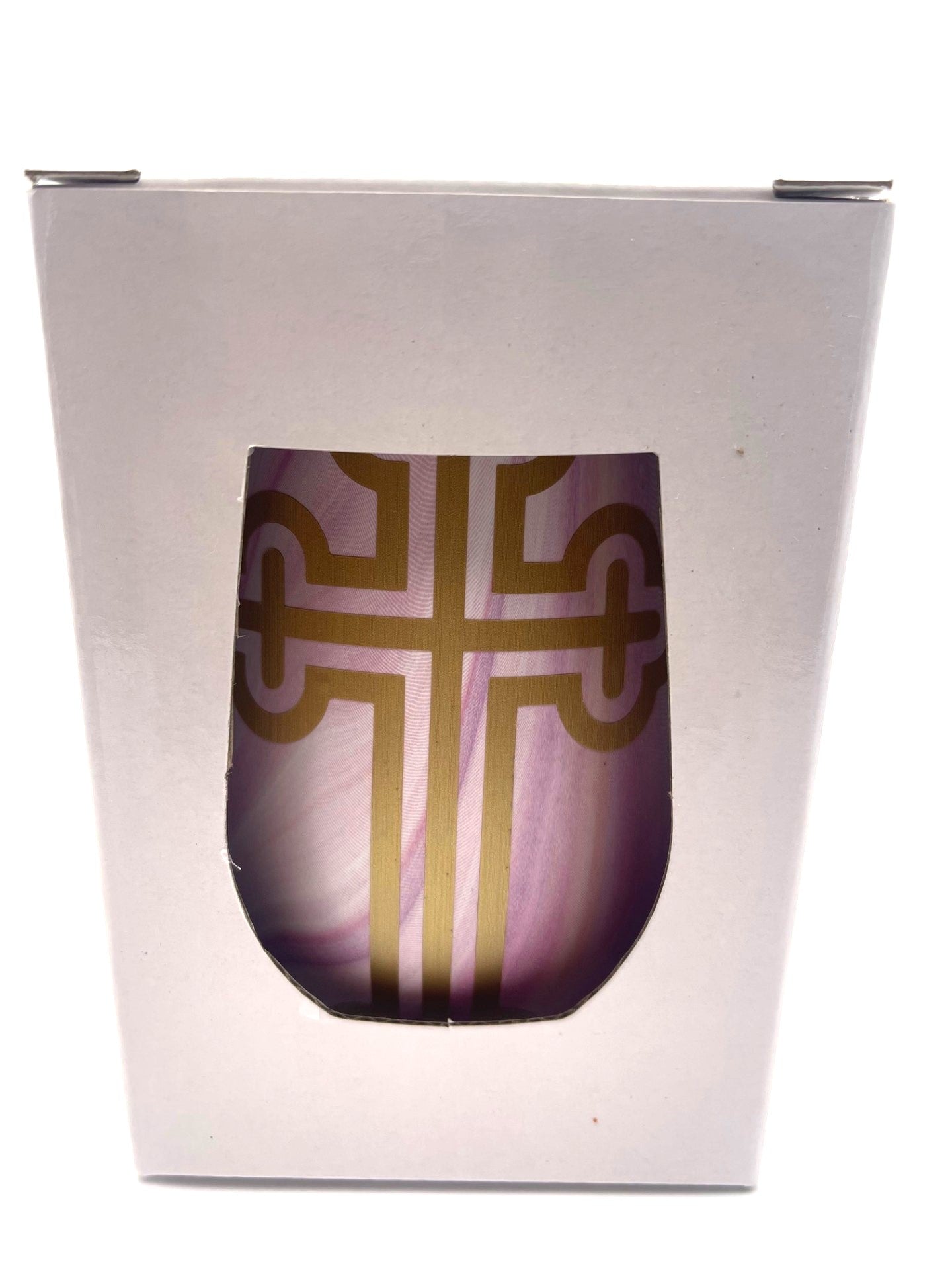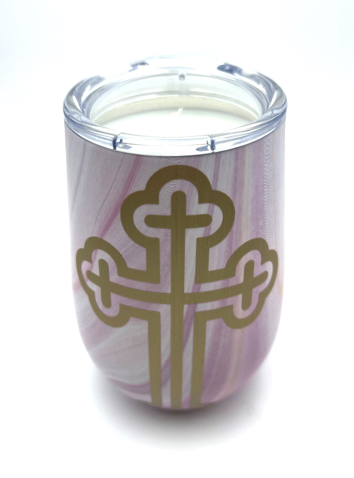 Religious Candle in Mug - Gold Cross (Pink Swirl) (Baccarat Rouge scent inspired)