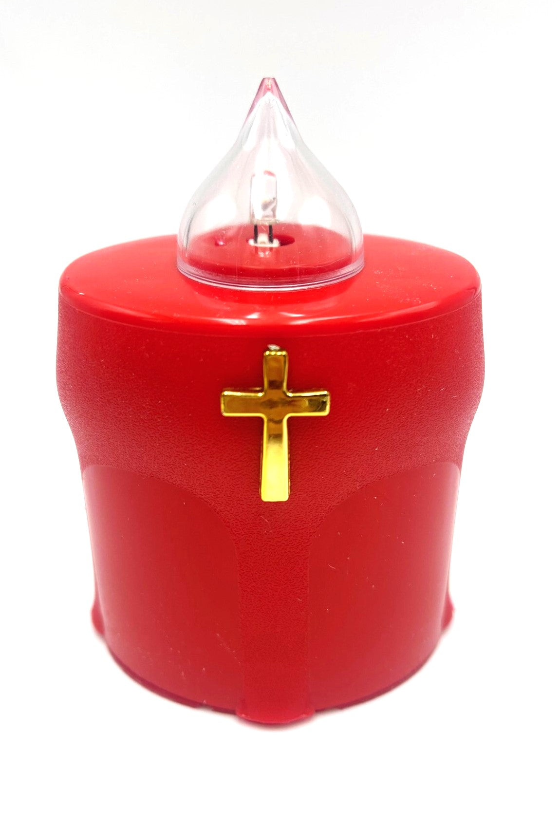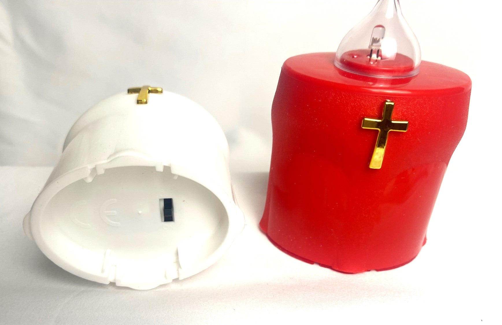 120 Day Electric Candle. Comes in a choice of Red or White embellished with a gold cross. Powered by 2 x AA Batteries (included).