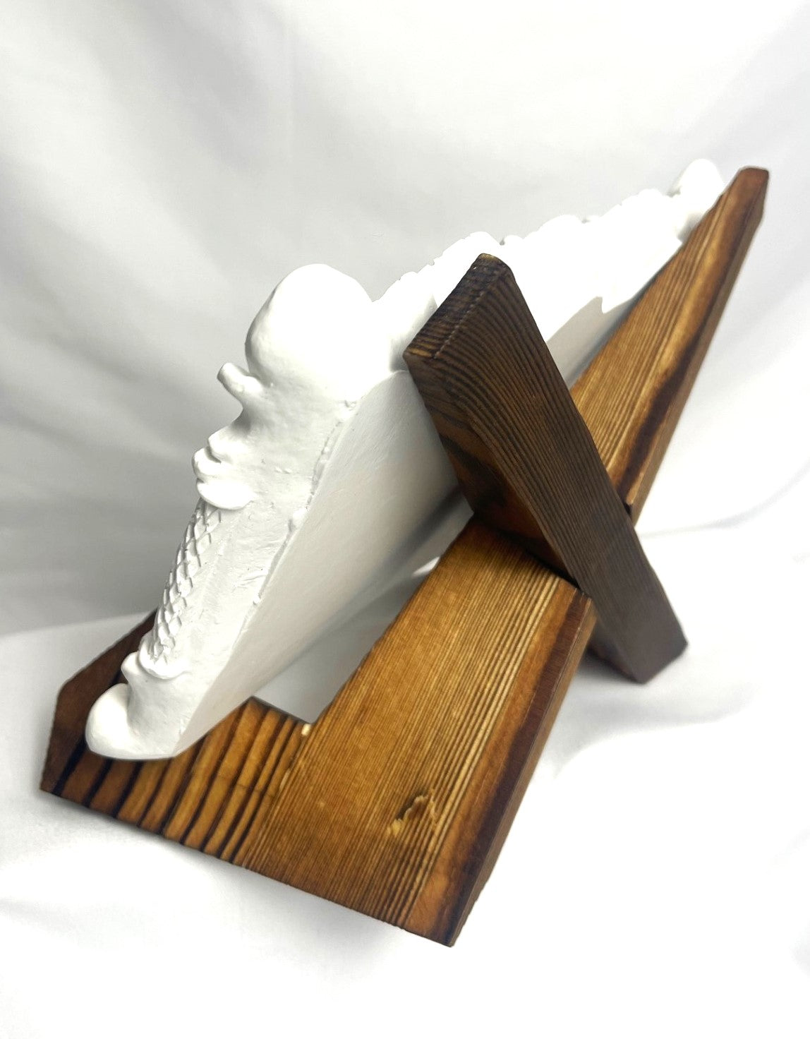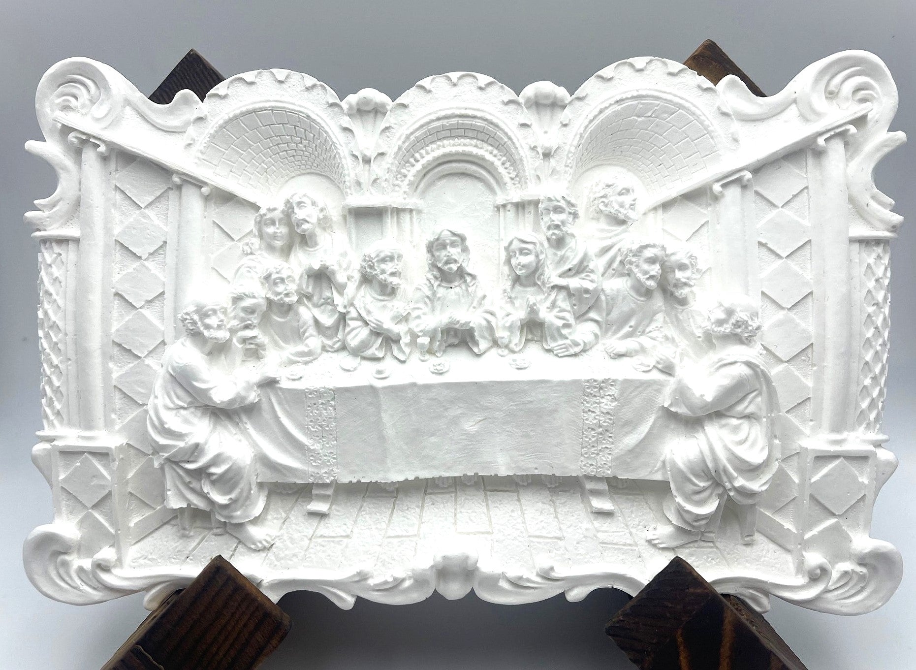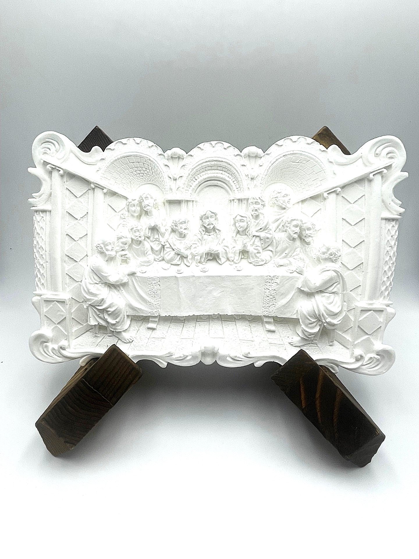 An elegant hand casted plaster Last Supper plaque that sits eloquently on a wooden stand. An amazing piece that will look great in any home and spiritual space.