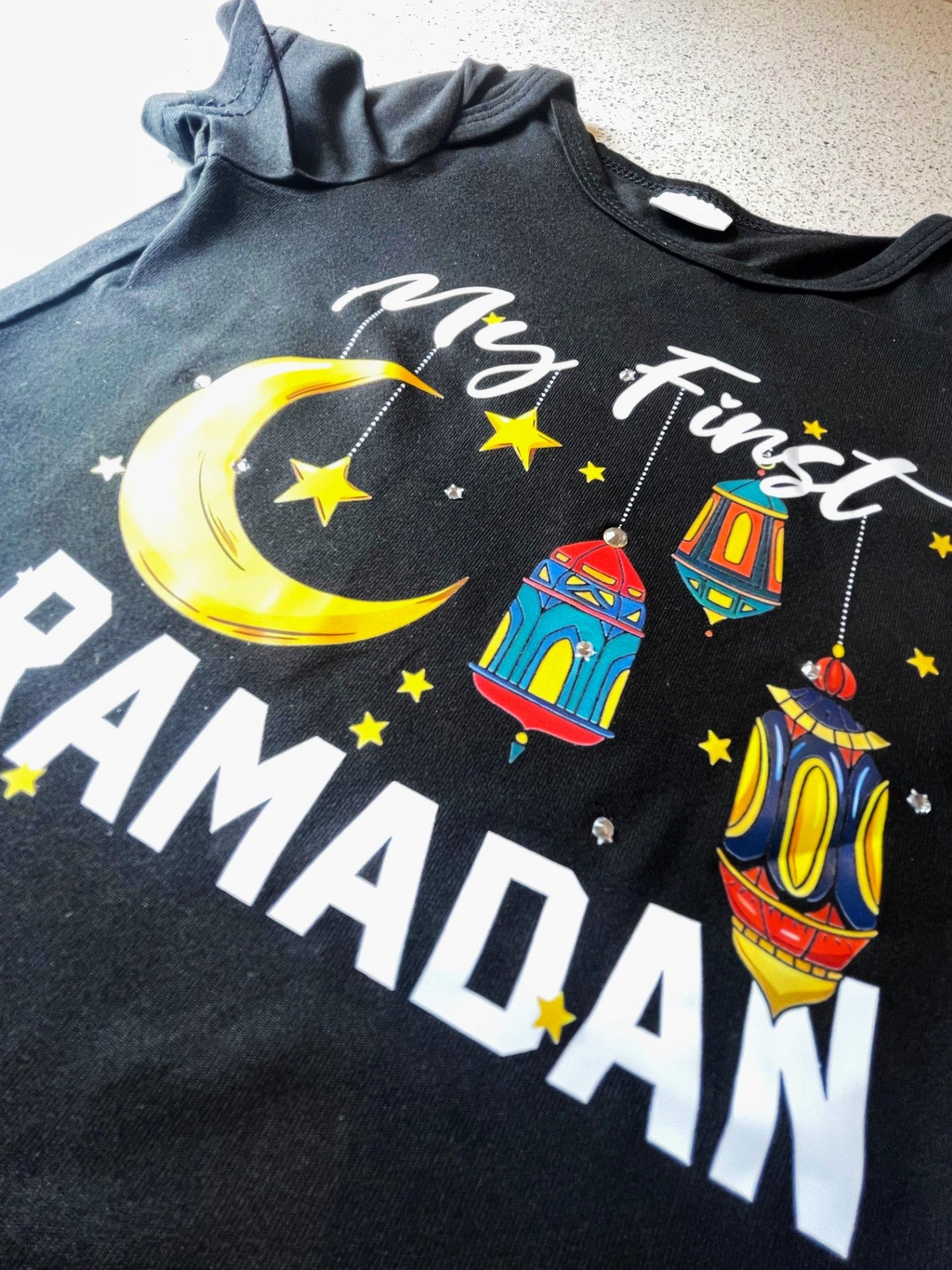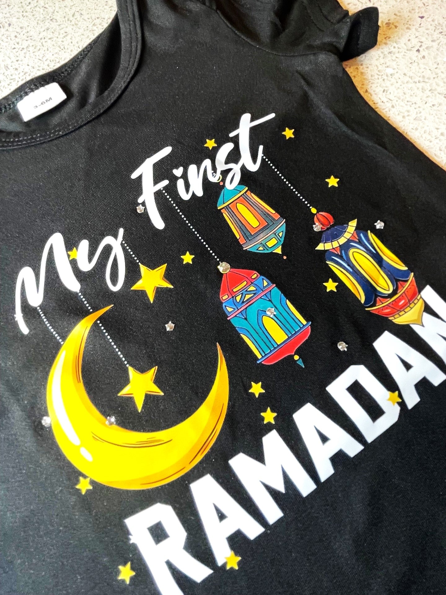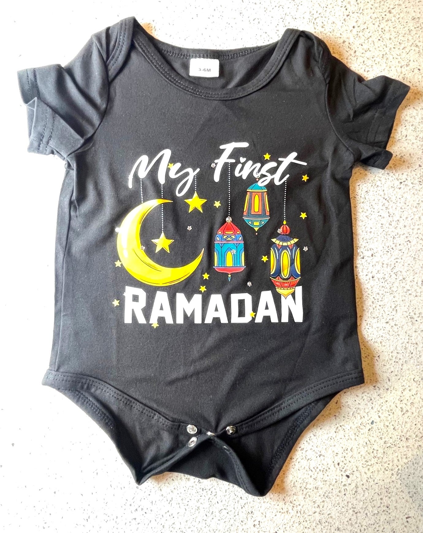 This soft polyester onesie is a perfect gift during this festive season. My first Ramadan onesie is for 3-6 month olds. Features a crescent moon and lanterns hand embellished with diamonties. Made in China