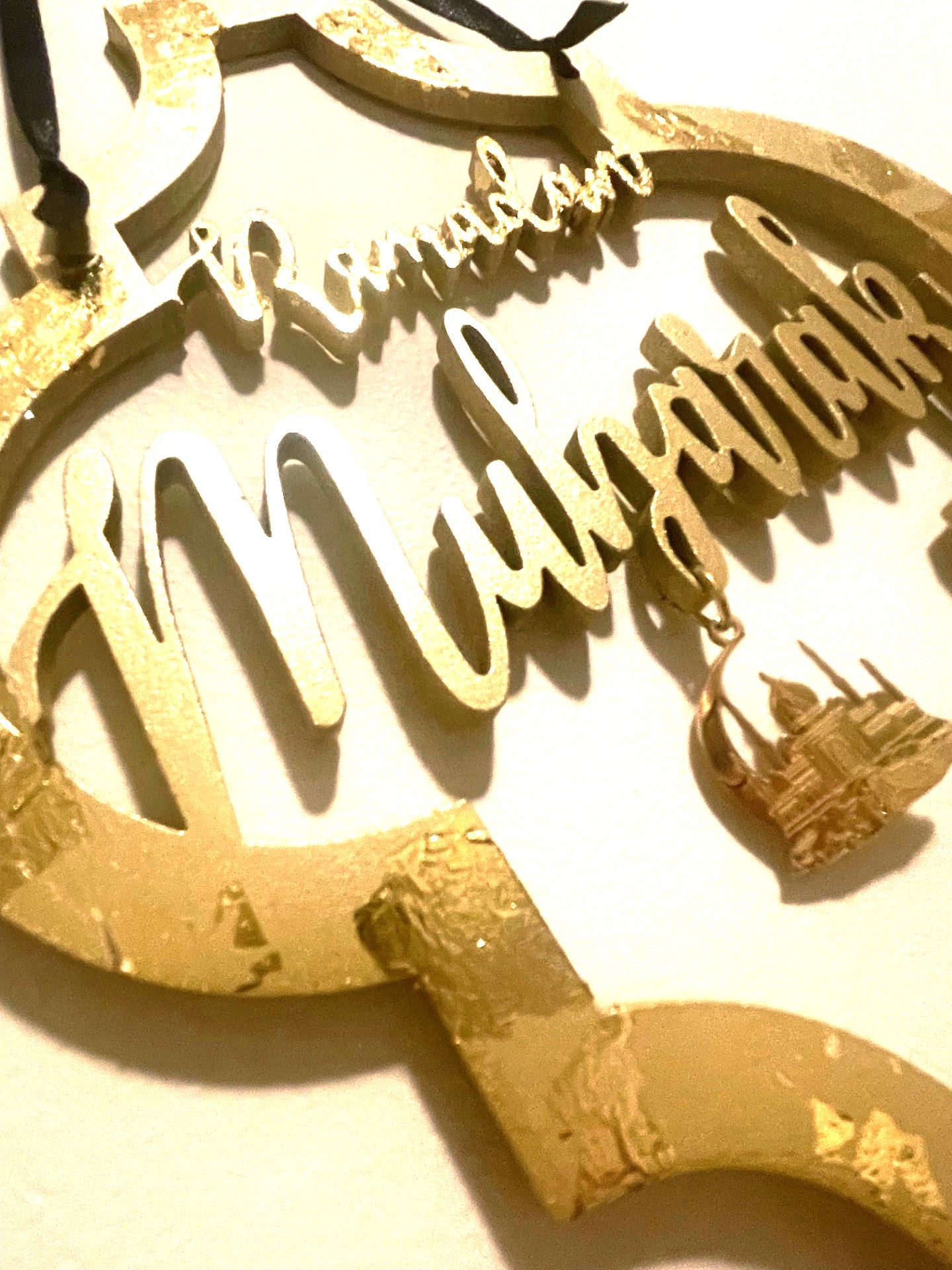A festive golden wall hanging to be displayed during the Ramadan Month. Embellished with gold leaf, a golden metal Mosque charm and a tassel on a golden MDF cut out.